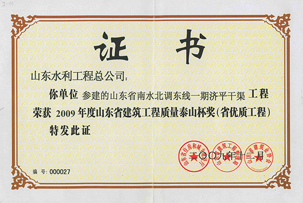 公司"山東省南水北調(diào)東線一期濟平干渠工程"榮獲2009年度山東省建筑工程質(zhì)量泰山杯