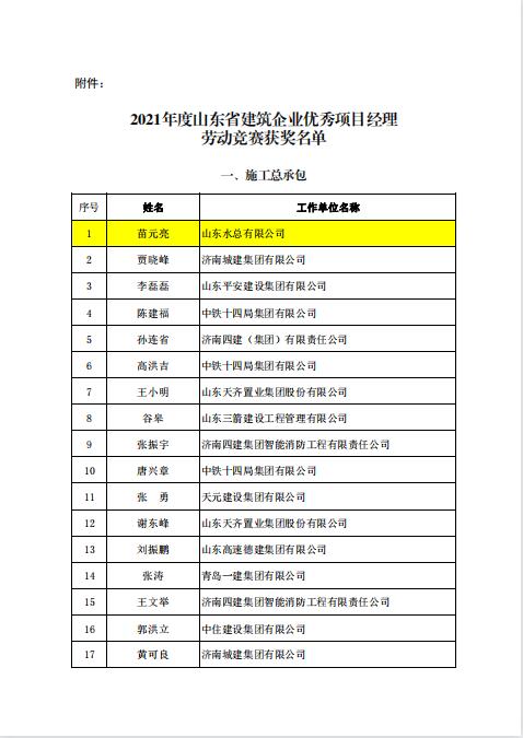 近日,由山東省建設(shè)工會(huì)和山東省建筑業(yè)協(xié)會(huì)組織開展的《2021年度山東省建筑企業(yè)優(yōu)秀項(xiàng)目經(jīng)理勞動(dòng)競(jìng)賽活動(dòng)》落下帷幕,經(jīng)雙方組成的工作委員會(huì)評(píng)議審定和綜合評(píng)審,我公司苗元亮、盧正雷、蔡國(guó)森三名同志被評(píng)為“山東省建筑企業(yè)優(yōu)秀項(xiàng)目經(jīng)理”。此項(xiàng)殊榮是山東省建筑行業(yè)項(xiàng)目經(jīng)理的最高榮譽(yù),旨在鼓勵(lì)受表彰人員再接再厲,發(fā)揮引領(lǐng)示范作用,創(chuàng)建更多精品工程。