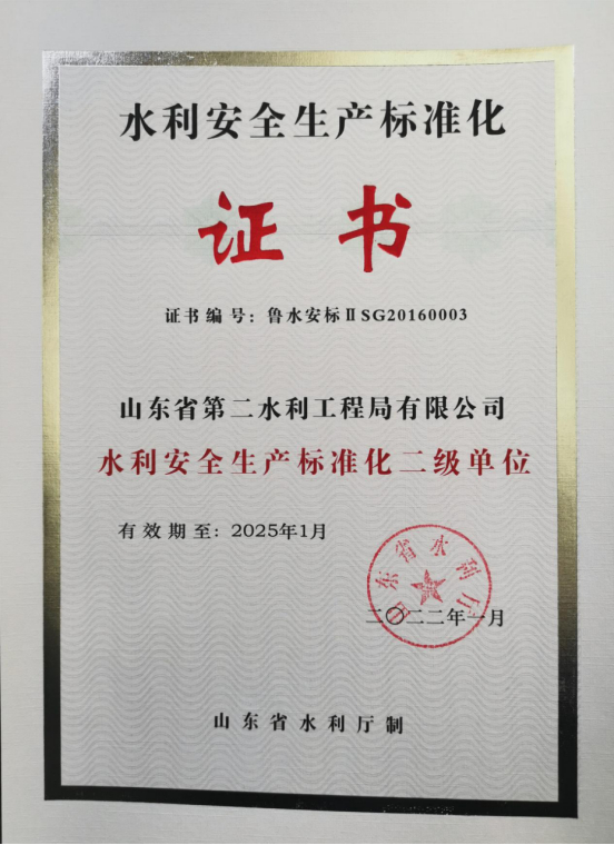 二局有限公司于近日順利通過了山東省水利廳水利安全標準化二級達標企業(yè)延期換證。