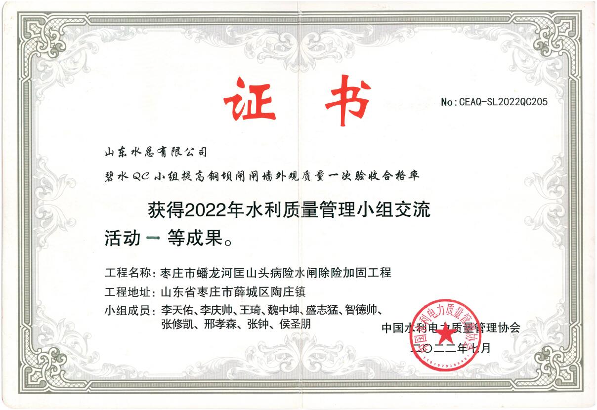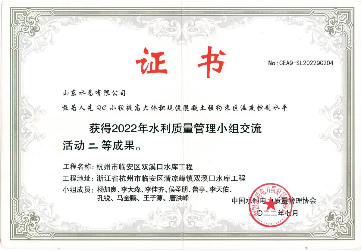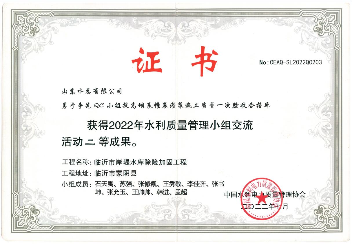 近日,中國(guó)水利電力質(zhì)量管理協(xié)會(huì)2022年水利質(zhì)量管理小組交流活動(dòng)結(jié)果與獲獎(jiǎng)名單揭曉,公司申報(bào)的《提高鋼壩閘閘墻外觀質(zhì)量一次驗(yàn)收合格率》獲得一等成果、《提高混凝土拱壩止水埋設(shè)一次驗(yàn)收合格率》《提高大體積現(xiàn)澆混凝土強(qiáng)約束區(qū)溫度控制水平》《提高壩基帷幕灌漿施工質(zhì)量一次驗(yàn)收合格率》3項(xiàng)成果獲得二等成果。