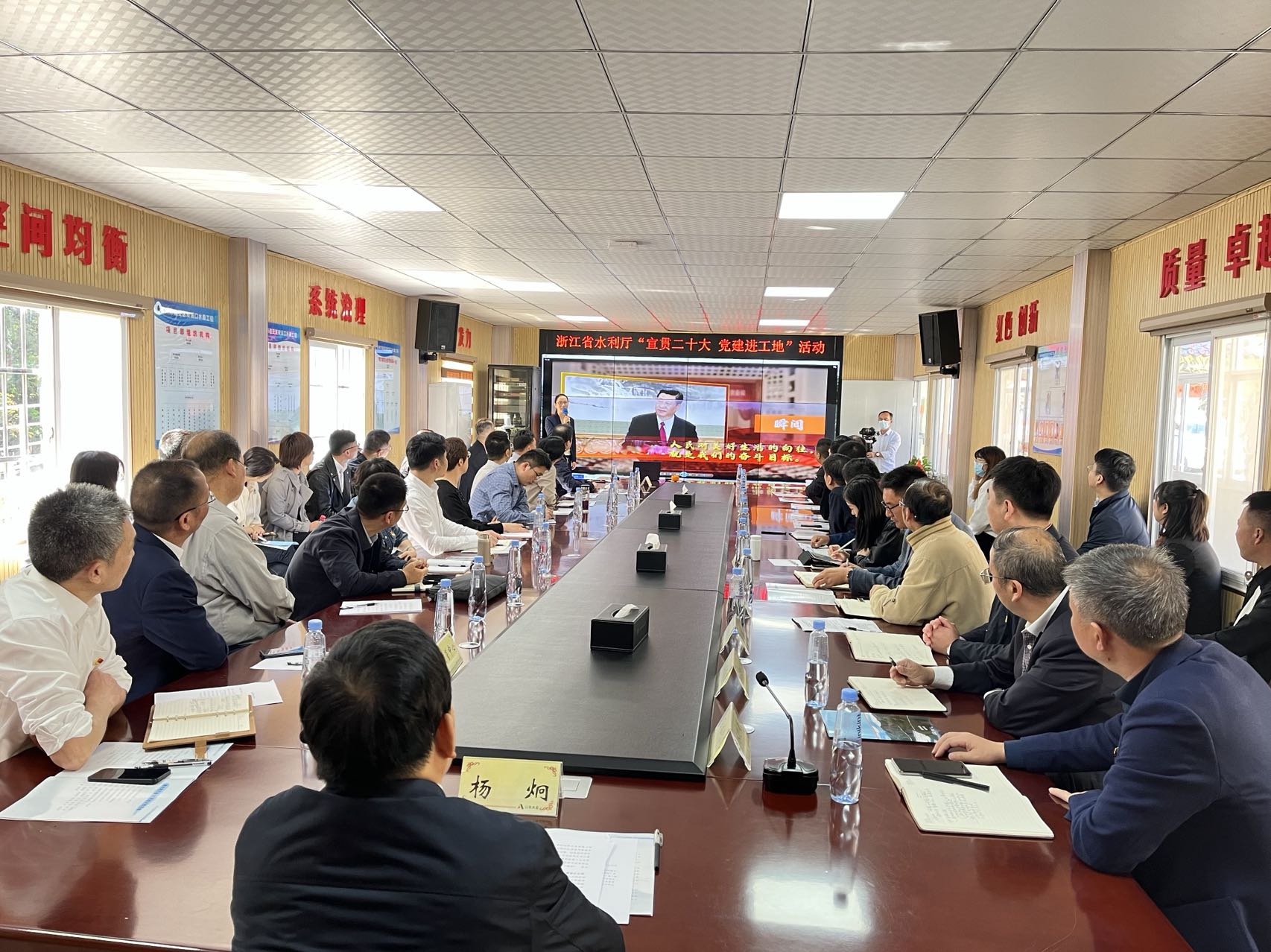 11月10日,浙江省水利廳副廳長楊炯率省水利廳建設(shè)處、質(zhì)管中心等負(fù)責(zé)同志到雙溪口水庫工程開展“宣貫二十大 黨建進工地”活動。此次活動旨在把黨建課堂搬到工程建設(shè)現(xiàn)場,把宣講“二十大”深入基層,充分激發(fā)廣大工程建設(shè)者建功新時代的積極性、主動性、創(chuàng)造性。