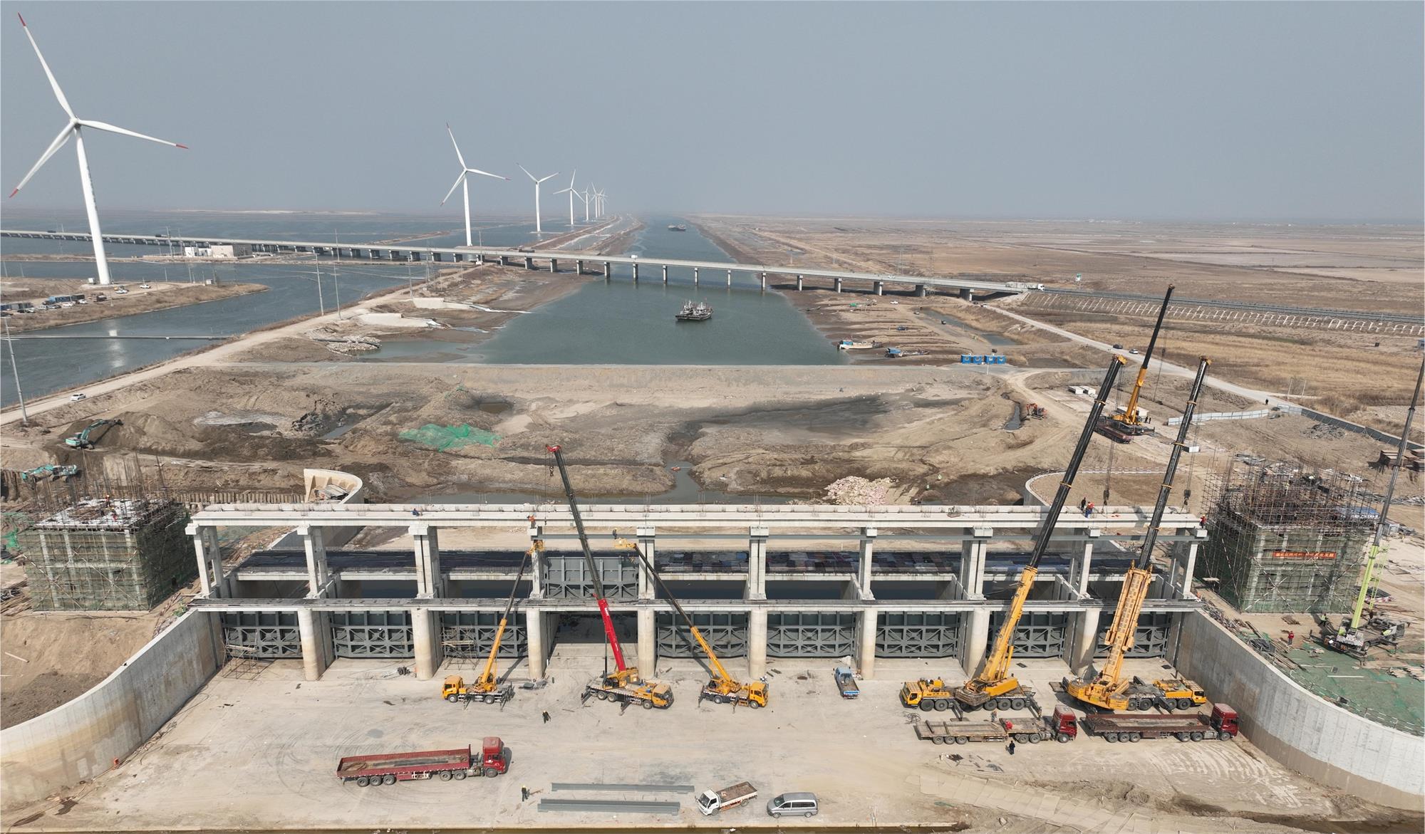 該項目自2023年開工以來,項目部秉著“起跑即沖刺、開局即決戰(zhàn)”的理念,克服臨海大風(fēng)惡劣天氣、高空作業(yè)及工序穿插作業(yè)等困難,通過項目部人員集思廣益,優(yōu)化施工方案,嚴(yán)格把控施工質(zhì)量,牢記安全紅線,一個月內(nèi)完成閘門安裝、交通橋板、檢修橋板及機(jī)架橋板吊裝等工作。