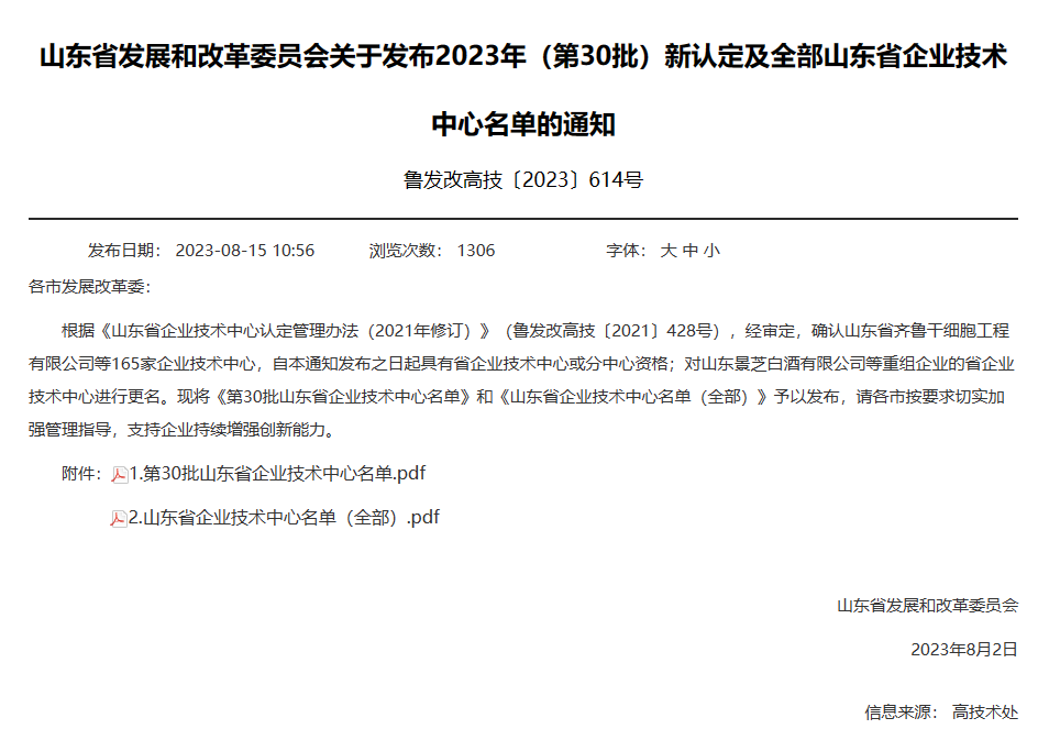 8月15日,山東省發(fā)展和改革委員會發(fā)布2023年山東省企業(yè)技術中心名單,公司憑借自身綜合創(chuàng)新能力成功入選,獲評山東省企業(yè)技術中心稱號。