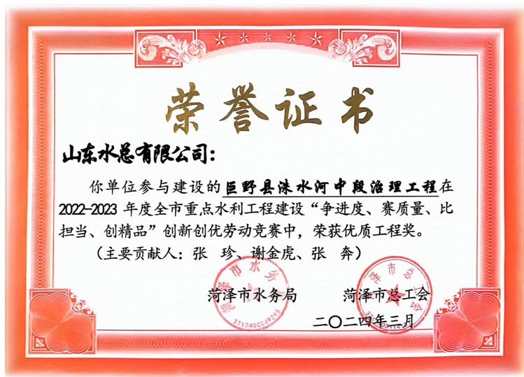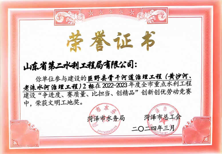 近日,菏澤市水務(wù)局、菏澤市總工會公布了“2022-2023年度全市重點水利工程建設(shè)“爭進度、賽質(zhì)量、比擔(dān)當(dāng)、創(chuàng)精品”創(chuàng)新創(chuàng)優(yōu)勞動競賽”獲獎名單,公司及權(quán)屬單位二局有限公司共榮獲優(yōu)質(zhì)工程1項、文明工地2項、QC成果1項,優(yōu)秀項目經(jīng)理1項。