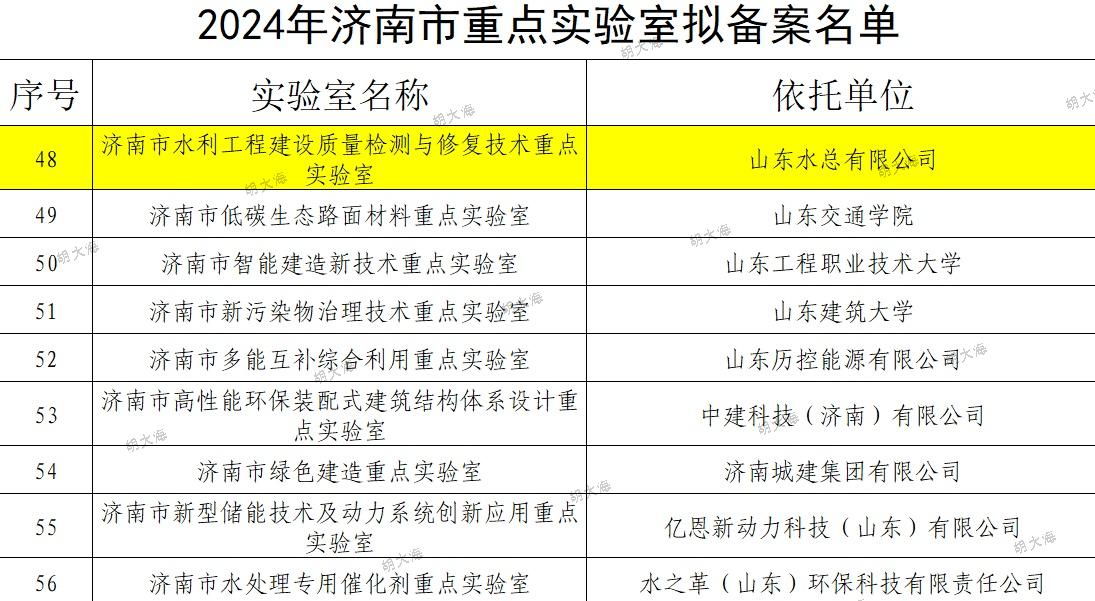 近日,濟(jì)南市科技局組織開展了2024年度濟(jì)南市重點實驗室備案工作。經(jīng)歷下區(qū)審核推薦、專家評審、現(xiàn)場考察、濟(jì)南市科技局黨組會研究,公司申報的濟(jì)南市水利工程建設(shè)質(zhì)量檢測與修復(fù)技術(shù)重點實驗室順利通過認(rèn)定。
