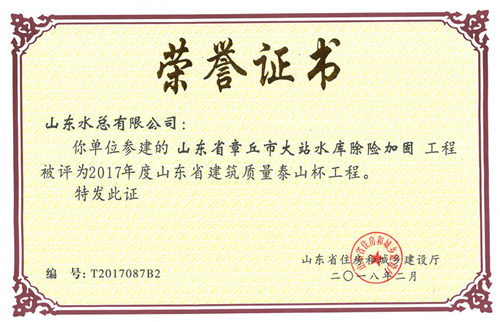公司“山東省章丘市大站水庫除險(xiǎn)加固工程”榮獲2017年度山東省建筑質(zhì)量泰山杯