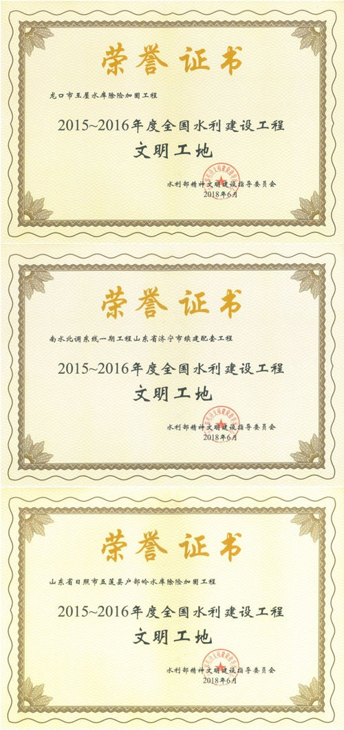 公司“龍口市王屋水庫除險加固工程”等項目榮獲“2015-2016年度全國水利建設工程文明工地”稱號