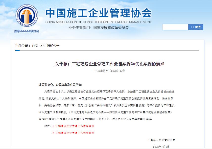 為展示黨的十八大以來工程建設(shè)行業(yè)在黨的領(lǐng)導下取得的偉大成就,總結(jié)推廣工程建設(shè)企業(yè)黨的建設(shè)的先進經(jīng)驗,迎接黨的二十大勝利召開,近日,中國施工企業(yè)管理協(xié)會組織開展了工程建設(shè)企業(yè)黨建工作優(yōu)秀案例評審工作,山東水總有限公司第六分公司黨支部的《塑品牌抓活動促活力 切實提升黨建工作水平》案例獲評“工程建設(shè)企業(yè)黨建工作優(yōu)秀案例”。